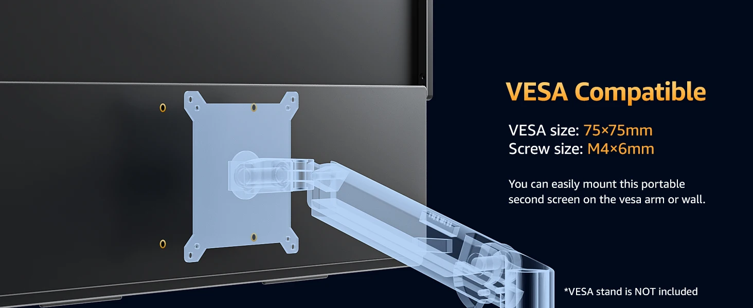 There are four VESA holes (M4*5mm, 75mm) on the back of this device, you can install it on the wall or on a bracket for fixed use, saving your desk space to put more devices, which can form a better collaboration with the computer.